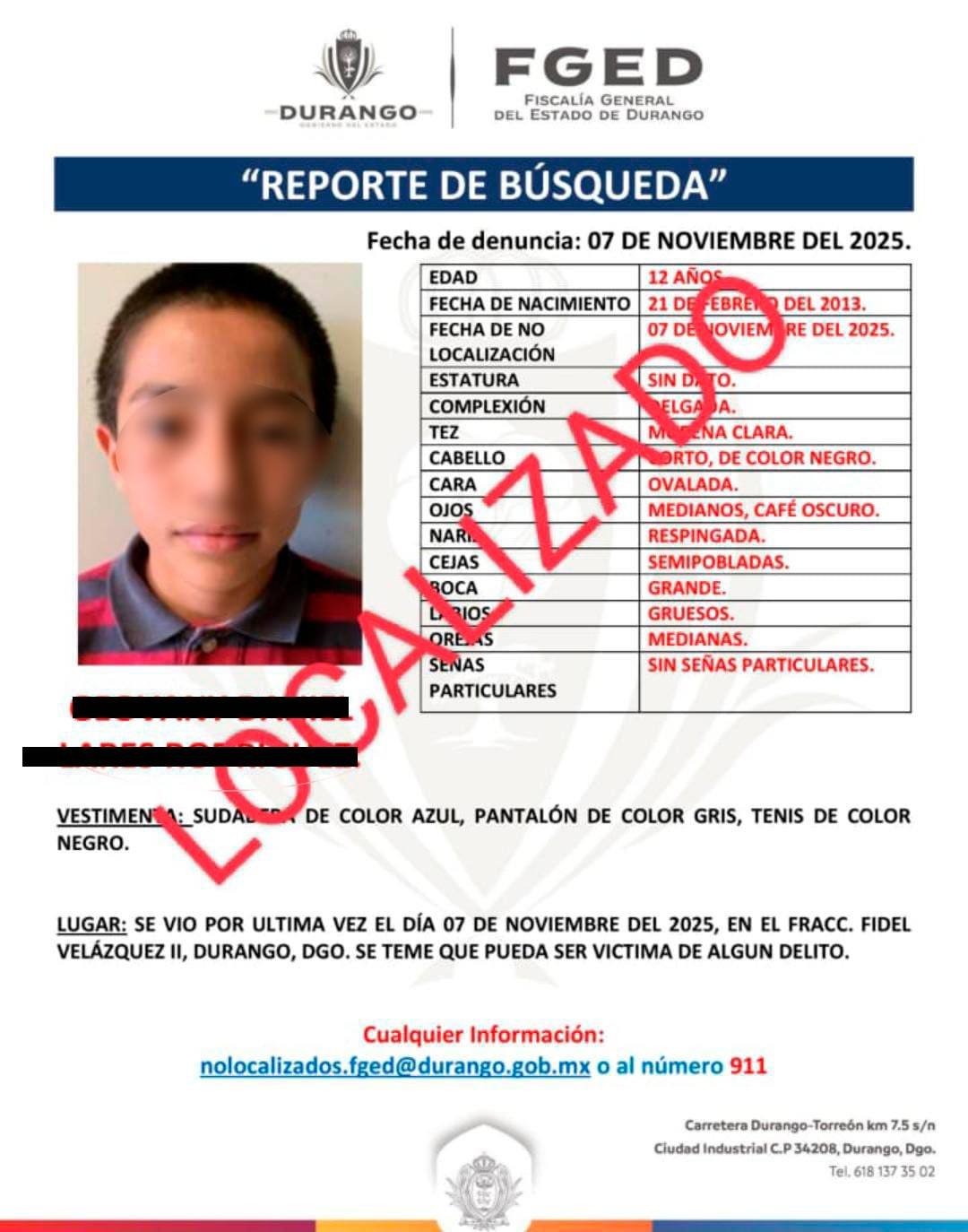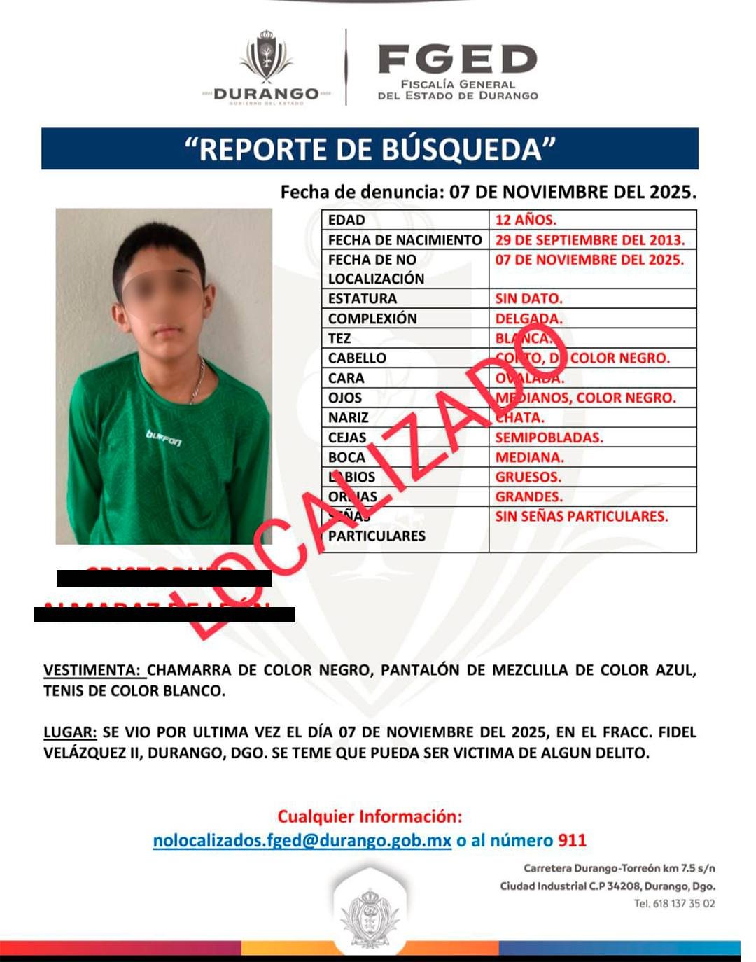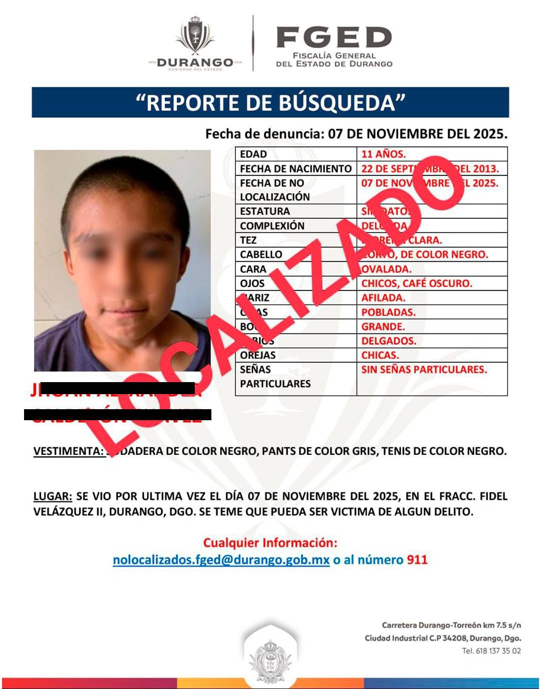Fueron localizados en buen estado de salud los tres menores de 12 años que habían sido reportados como desaparecidos desde el pasado 7 de noviembre, informó la Fiscalía General del Estado de Durango (FGED). Su búsqueda había sido difundida a través de fichas oficiales y redes sociales, luego de que se les viera por última vez en el fraccionamiento Fidel Velázquez II, en la ciudad de Durango.